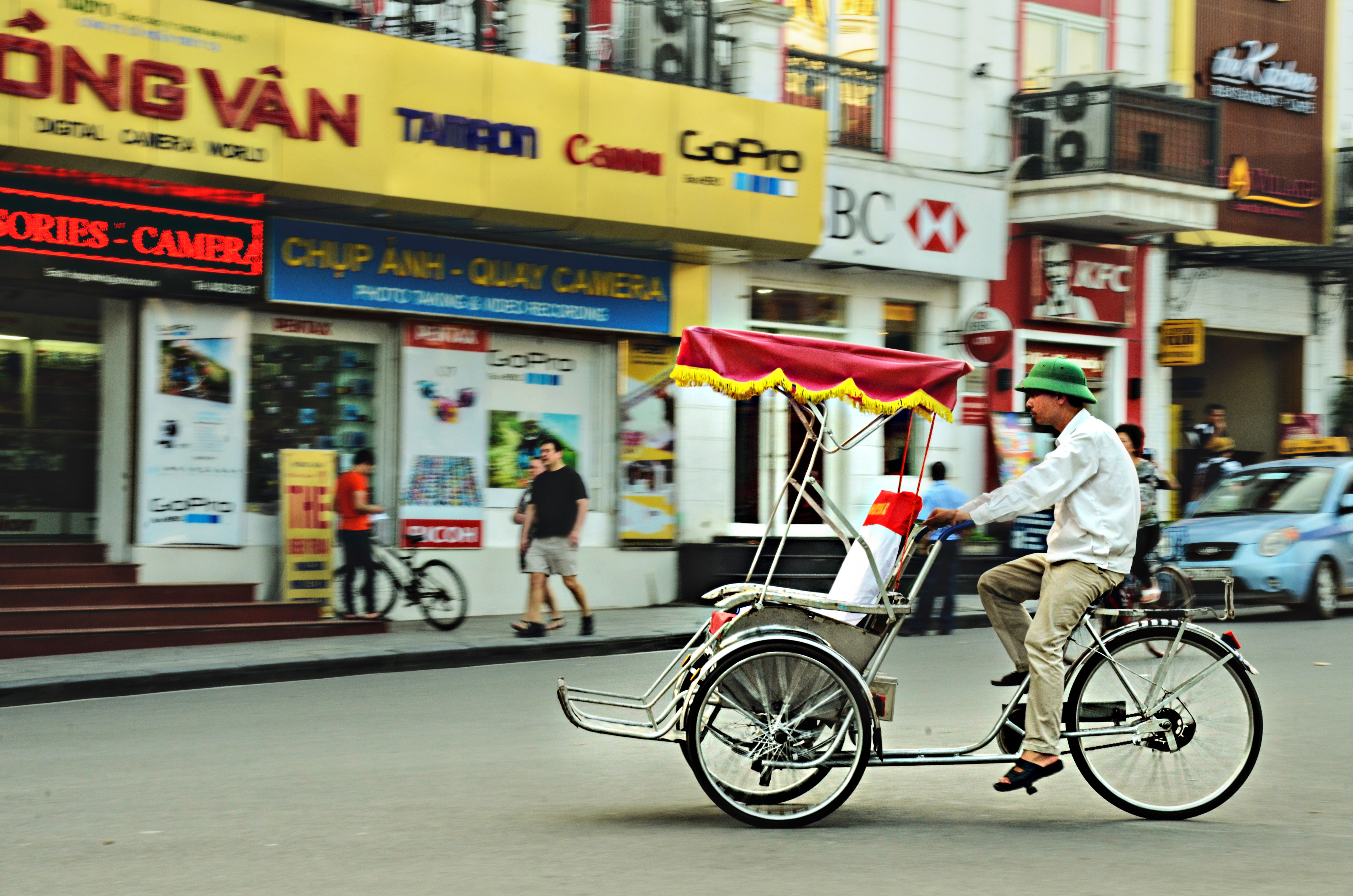 Afterward we dove headfirst into the wild Old Quarter night and searched for food and bags among the low chairs and tables lining the sidewalks. The roads itself could barely be seen from all the people eating, hanging out or just plain being there. Motorcycles zoomed from every direction A loud, grating, pervasive chirping in different languages overloaded the eardrums. And peddlers rolled their wares into every corner they could fit. It was amazing how many things were crammed into the narrow streets. At some point I saw myself just standing there ogling at the amazing insanity of it all.