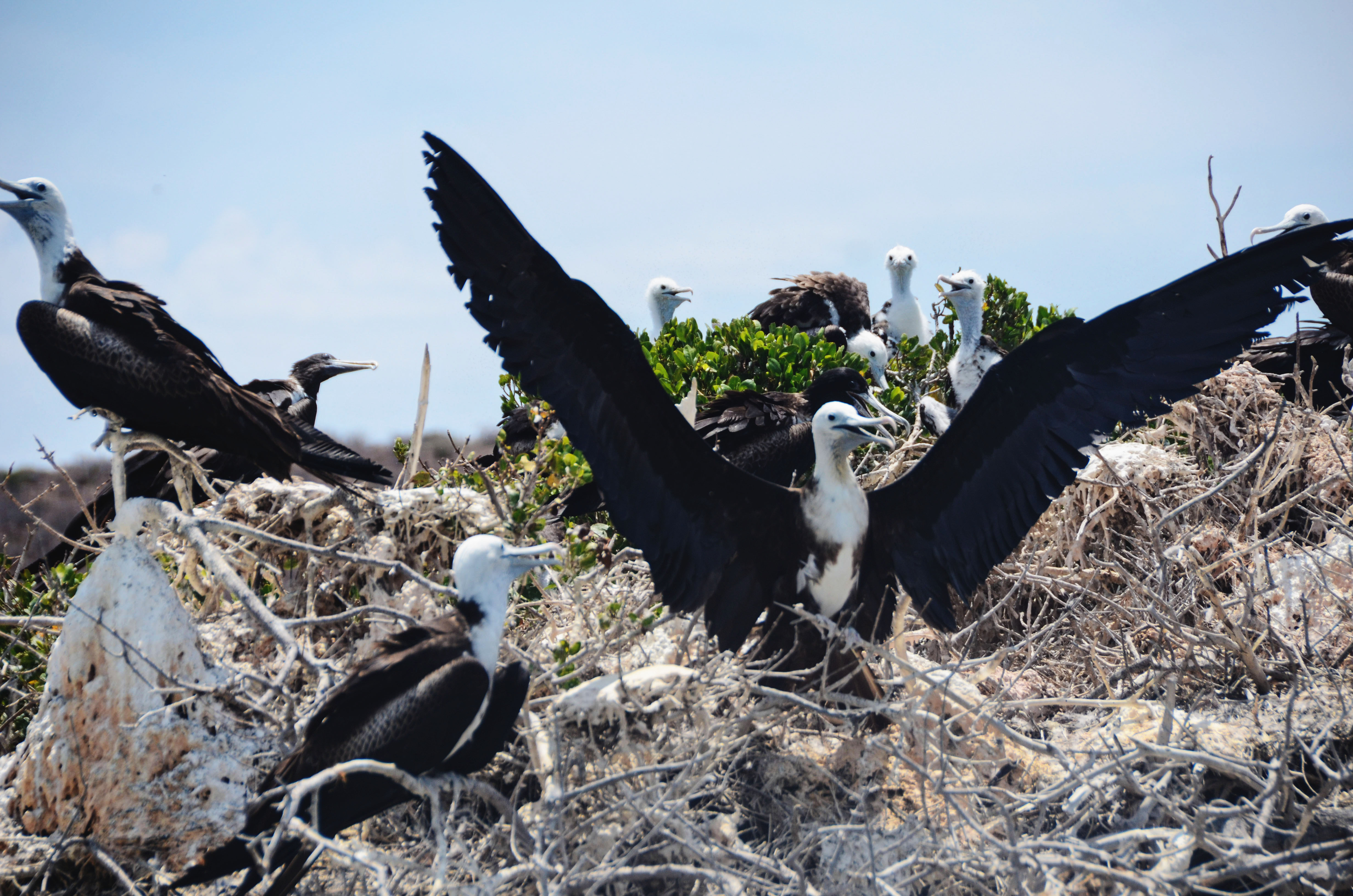 We also made a quick stop to an island inhabited by frigates. They’ve been swooping overhead throughout the trip, but I never realized how large they were until I saw them up close. They’re sea birds, just like pelicans, and this particular colony owned this little islet in the middle of the sea. It reeked of their poop, but it was still pretty cool to watch them interact, hang around lazily, and do their thing. They were constantly squawking at each other, exchanging screeches and flapping around, obviously inhabiting the island as a community with their own set of functions.